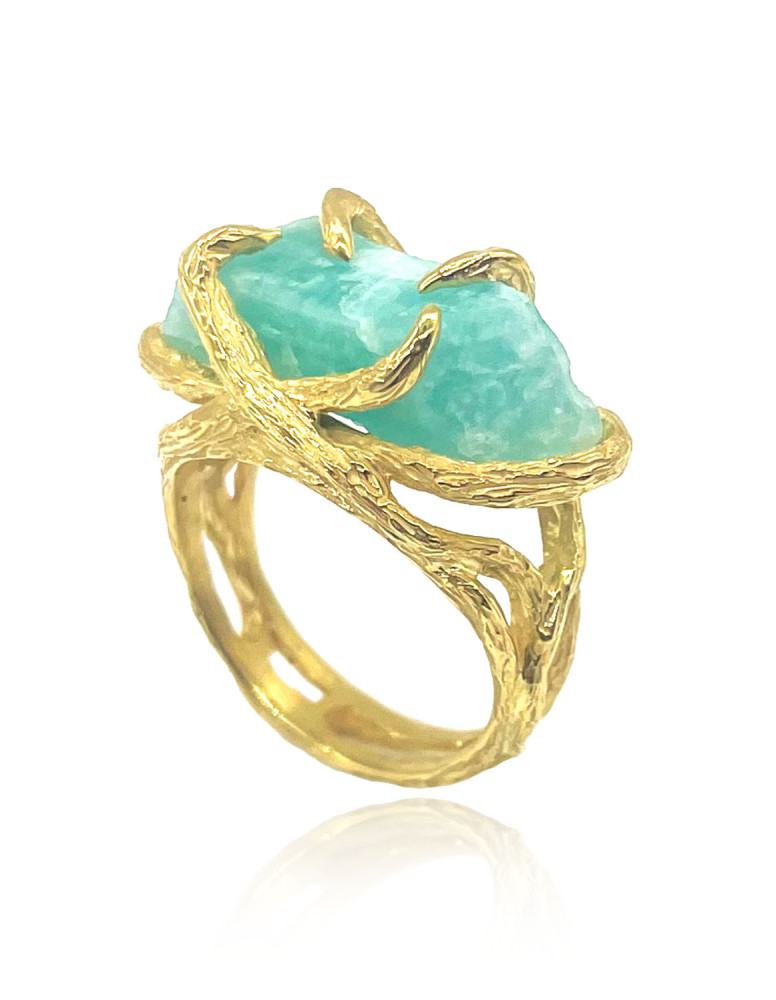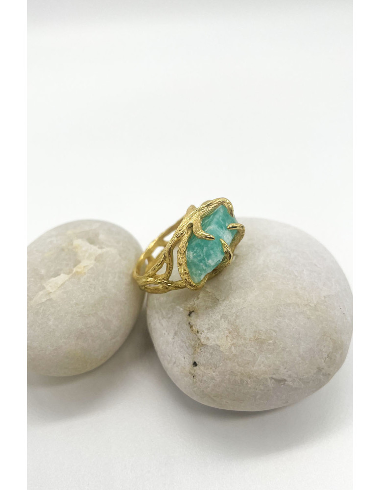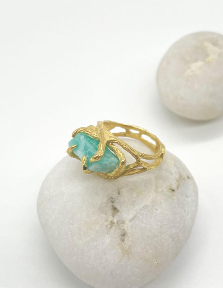 Jewelry’nin Silent Forest Koleksiyonu'na ait Mossira Yüzük, doğanın enerjisini zarif bir tasarımla buluşturuyor. Bu el yapımı yüzük, büyüleyici yeşil tonları ile amazonit taşını, 925 ayar gümüş üzerine 18 ayar altın kaplama ile birleştirerek, tek ve eşsiz bir parça olarak tasarlanmıştır. Amazonit taşının huzur ve denge sağlayan doğasından ilham alan Mossira, ormanın derinliklerindeki dinginliği elinizde hissettirir. Hem günlük hayatta hem de özel günlerde stilinize mistik bir dokunuş katan bu yüzük, koleksiyonunuza ayrıcalıklı bir değer katacak.