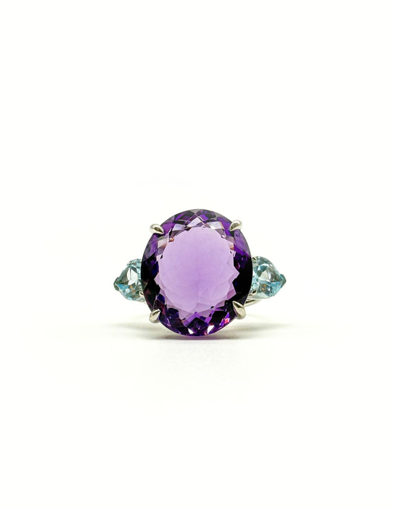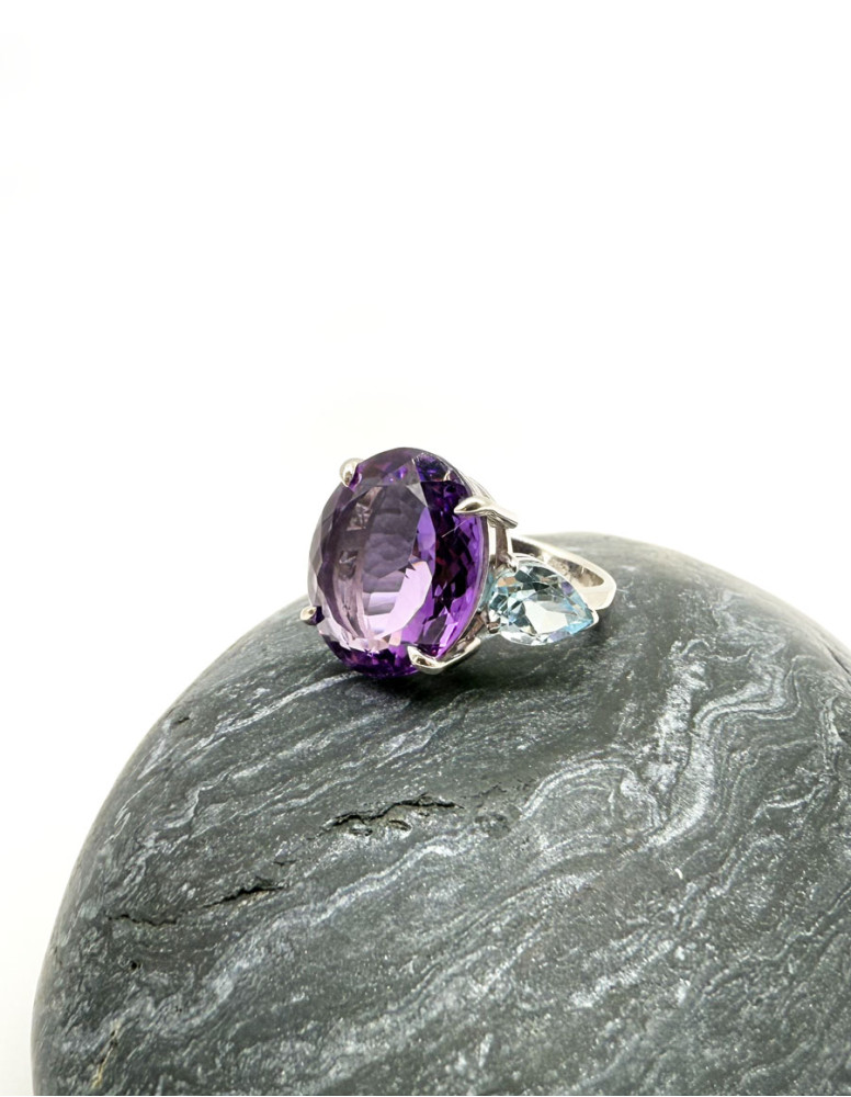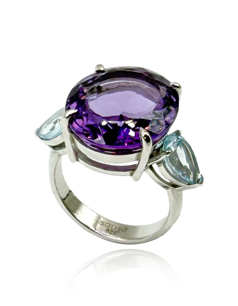 Jewelry’nin Classic Inspiration Koleksiyonu’ndan gelen büyüleyici bir tasarım: Violet Ametist ve Akuamarin Taşlı Yüzük. Doğanın zarafetini ve mistik enerjisini taşıyan bu yüzük, 925 ayar gümüş üzerine uygulanmış beyaz altın ve rodyum kaplama ile parlıyor. Şıklığı tamamlayan ametist ve akuamarin taşları, saf güzellikleriyle göz kamaştırıyor. Her detayı el işçiliği ile şekillendirilmiş olan bu eşsiz yüzük, biricikliği ve zarafetiyle öne çıkıyor. Violet Yüzük, günlük kombinlerinize sofistike bir dokunuş katarken, özel günlerinizde sizi farklı kılacak unutulmaz bir mücevherdir.